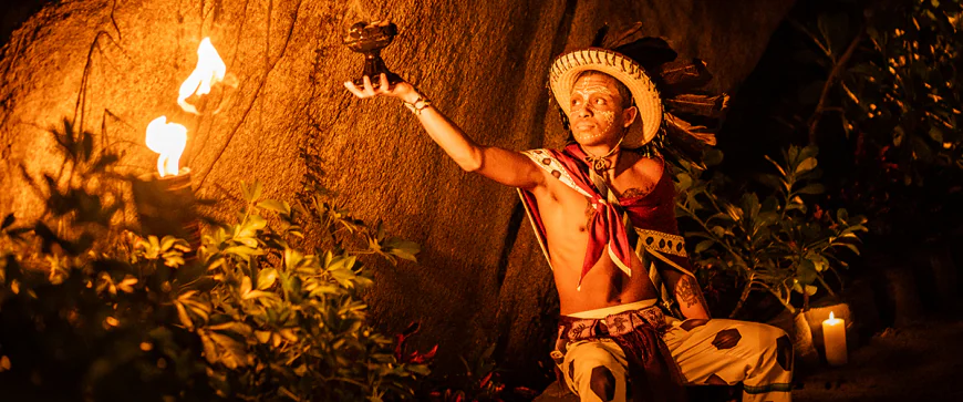 El escenario es Las Caletas, una playa escondida al sur de la bahía, accesible solo en barco. De día es un paraíso tropical donde se puede practicar kayak, esnórquel o paddleboard; de noche, se convierte en un teatro natural en el que la selva, el fuego y las luces cobran vida.