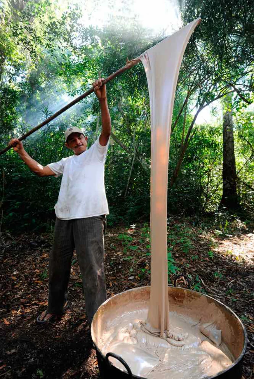La extracción se realiza mediante una técnica ancestral: el chiclero escala el árbol y realiza cortes en forma de zigzag para recolectar el látex, sin dañar al árbol, permitiendo que se regenere durante años.