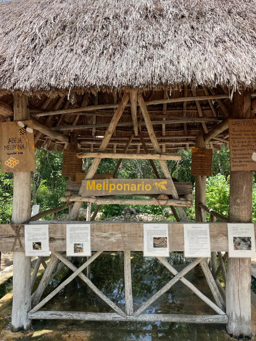 Desde que llegas, te envuelve un ambiente tranquilo, rodeado de vegetación y del zumbido constante de las abejas, esas pequeñas guardianas de la naturaleza que tanto nos enseñan. El recorrido comienza con una explicación fascinante sobre la importancia de las abejas en nuestro ecosistema, y sobre todo, sobre las especies que se cultivan aquí: la melipona, considerada sagrada por los antiguos mayas, y la apis melífera, conocida por su intensa producción.