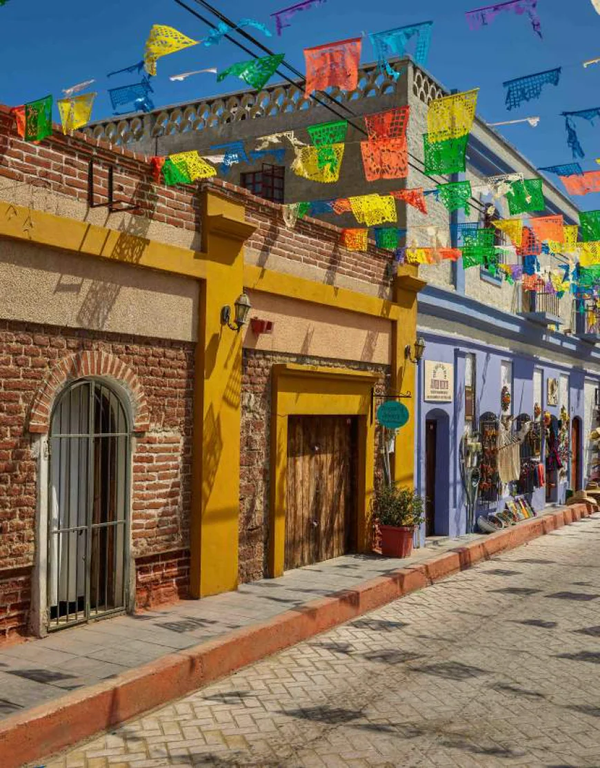 La mejor forma de llegar a Todos Santos es dejar el coche y caminar. Las calles adoquinadas, las fachadas blancas y los portales coloniales componen un escenario perfecto para perderse sin prisa. En la Plaza de Armas, entre palmeras y sombra fresca, comienza el viaje sensorial. A unos pasos está la Misión de Todos Santos, fundada en 1720, cuya serenidad contrasta con el bullicio artístico del pueblo.