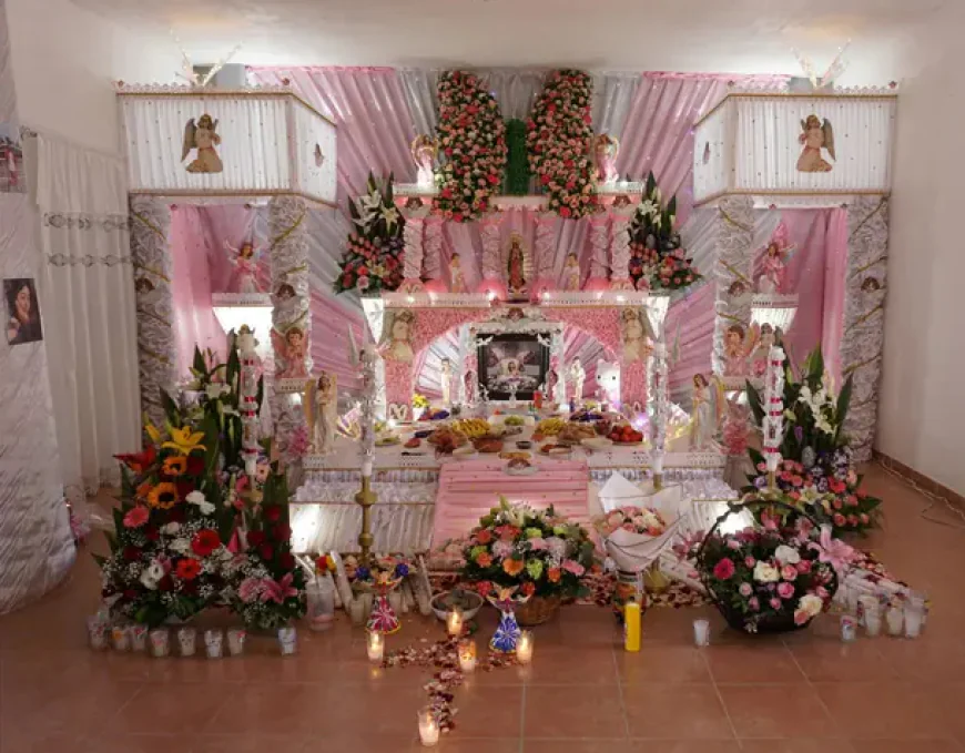 - Altares decorados con telas blancas, flores, fotos, panes, frutas y veladoras.