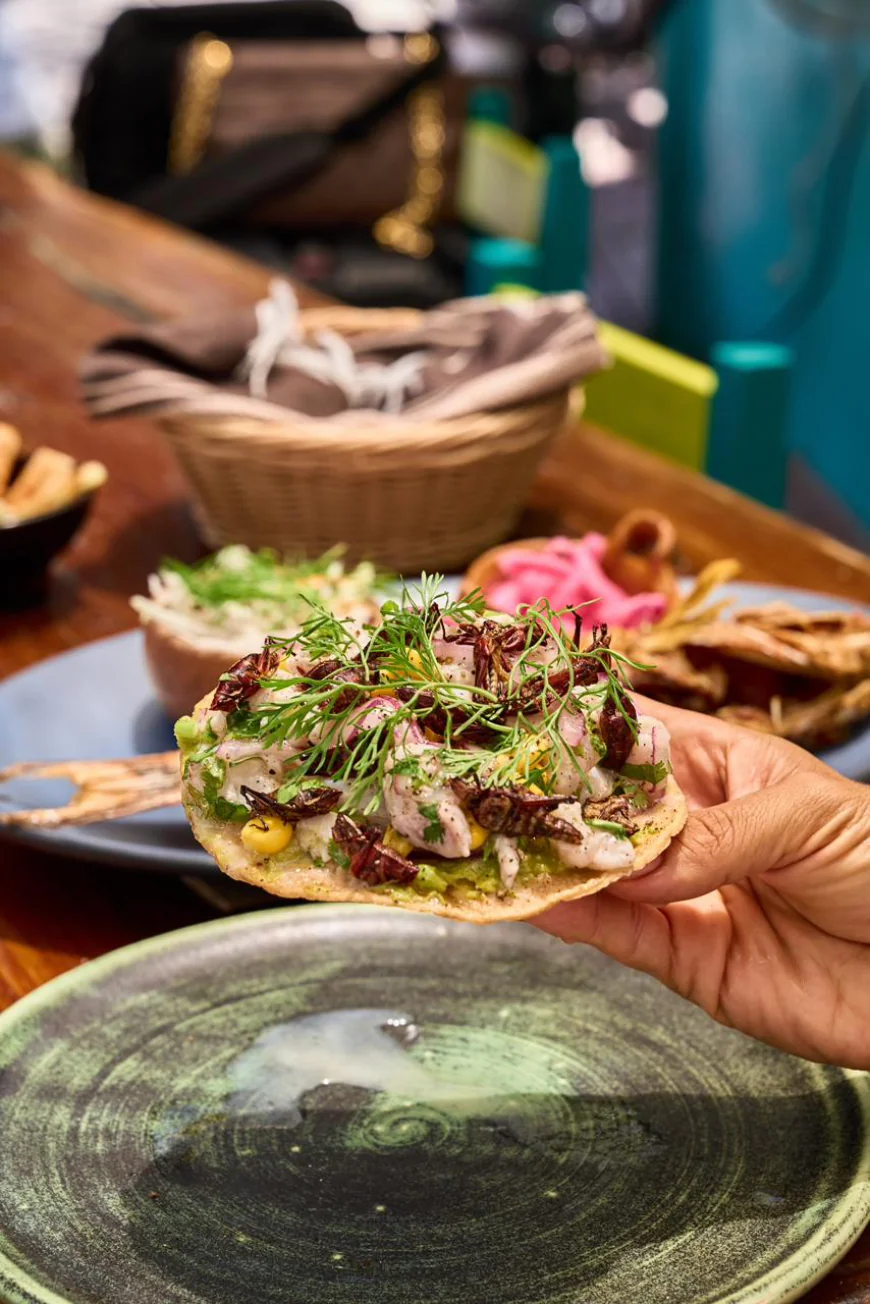 Imagen: Kiosko Verde.Tostada de Pescado con Chapulines, Puerto Juárez, Quintana Roo